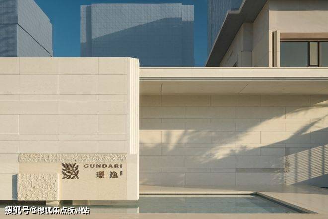 示范区建筑体采用的是米白色的莱姆石镶嵌超大玻璃,莱姆石在阳光的照耀下仔细一看有母贝的光泽效果。把光影作为设计语言引入,让建筑显得纯净,却又不失现代感。