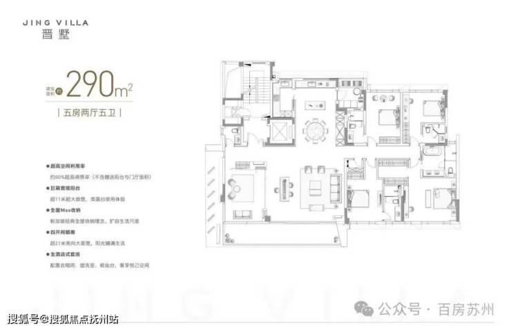 290㎡户型则规划为5房5卫,得房率高达90%,四开间朝南设计,面宽达12米,并配有11米巨幕阳台。
