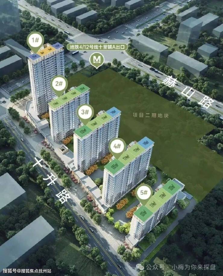 天创云和奕一期目前已经报规,因为项目地块狭长,项目的布局方式是沿着十升路由南到北一字排开的布局,带来的问题是所有楼栋都临街项目共规划为5栋11-26层的高层住宅+沿十升路分布有部分底商,住宅共计335户,户均面积116平,车位配比1:1.07,共计360个。