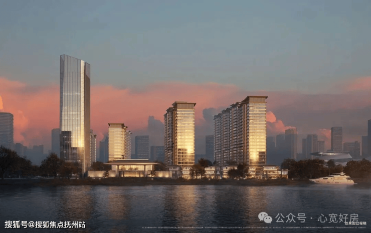 建筑立面以观澜屏玻璃立面辉映江水波澜与天际浩瀚,香槟金格栅是鎏金显贵,黄金缕线条流畅灵动,新中式韵律之美点缀CBD天际线。