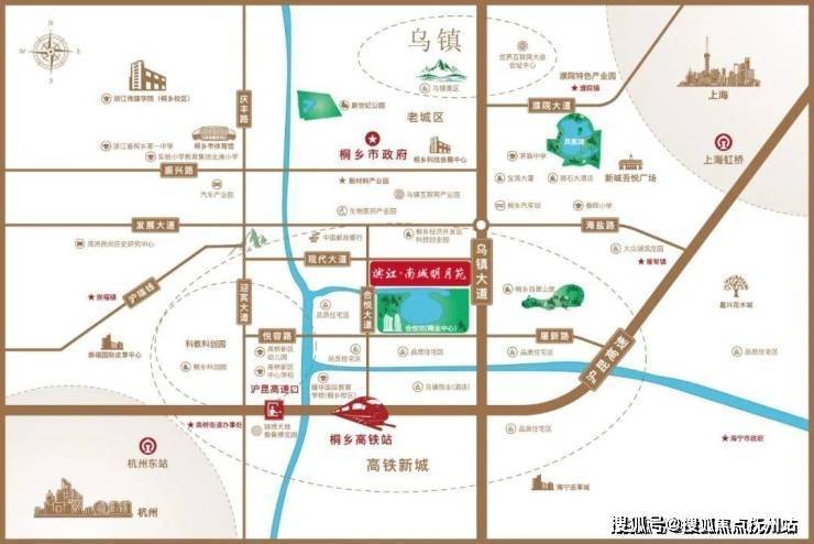 滨江·南城明月苑售楼处电话:400-1788-332项目位于乌镇大道与现代大道城市双主轴, 可通达桐乡各个区域,市政交通便利;距离高铁站约2公里处,乘坐沪杭高铁,从桐乡到杭州火车东站高铁仅 17 分钟,到上海虹桥站高铁也仅需40分钟;而且沪杭高速路口离项目仅约3公里,开车也可快速可抵达杭州、上海。