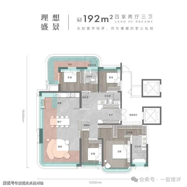 该户型约15.2米南向大开间+270°环幕视野,南北双豪华套房实现两代人居住平权,独立家政间、储藏室兼顾实用与格调,如同空中别墅,是终极改善的理想型。