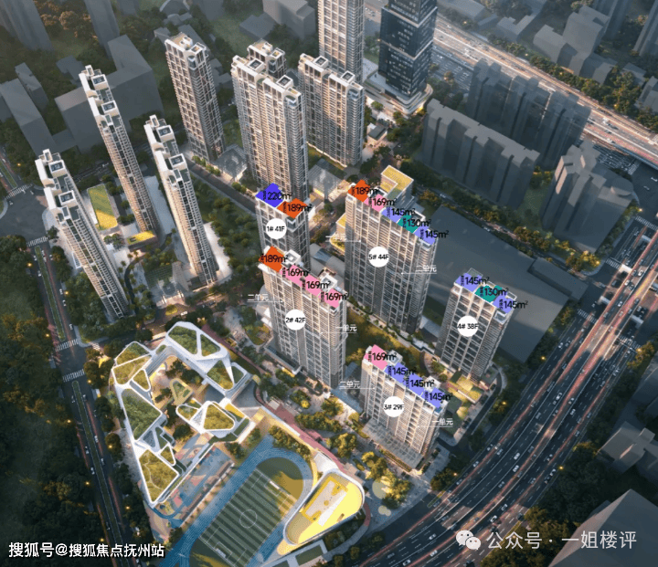 住宅方面,项目首先开发的是一期C地块,规划总建面约19.6万方,容积率约2.61,主要由4栋超高层、1栋高层、一所九年一贯制学校组成。