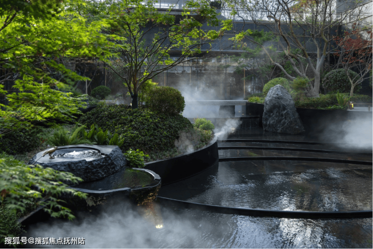 庭院中石桥、流水、树木交相辉映,松树为基,种植高海拔甄选树木,移栽时全冠保护、精准定位,在空中构建起浓密的林冠覆盖层,枝叶交错如天然华盖。